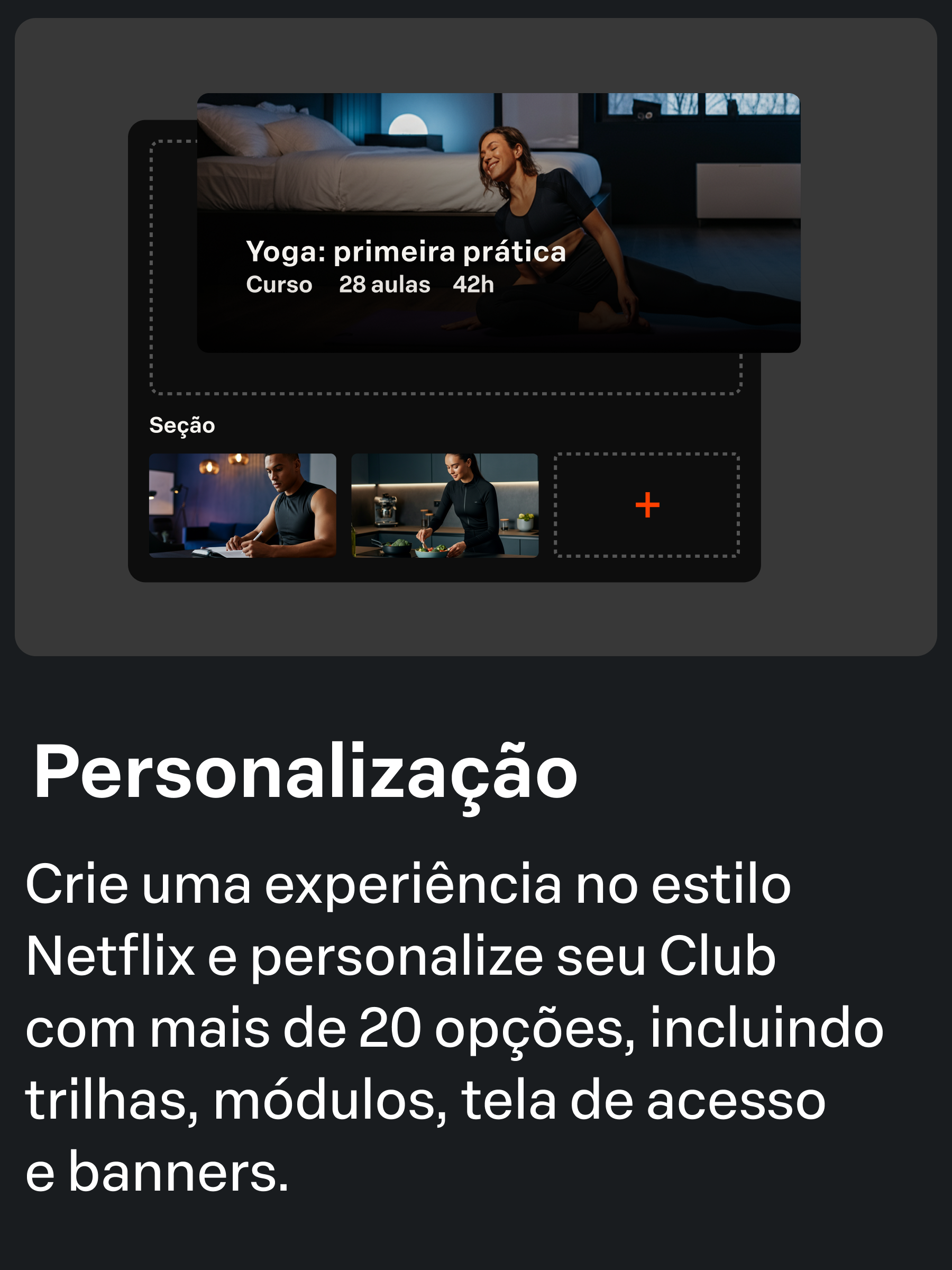 No Club você tem mais de 20 opções para aplicar sua identidade e criar uma verdadeira experiência estilo Netflix. Personalize o seu domínio, tela de acesso, cores, imagens, seções, comunidade, módulos e trilhas. Para mais informações para personalizar sua área de membros, acesse aqui.